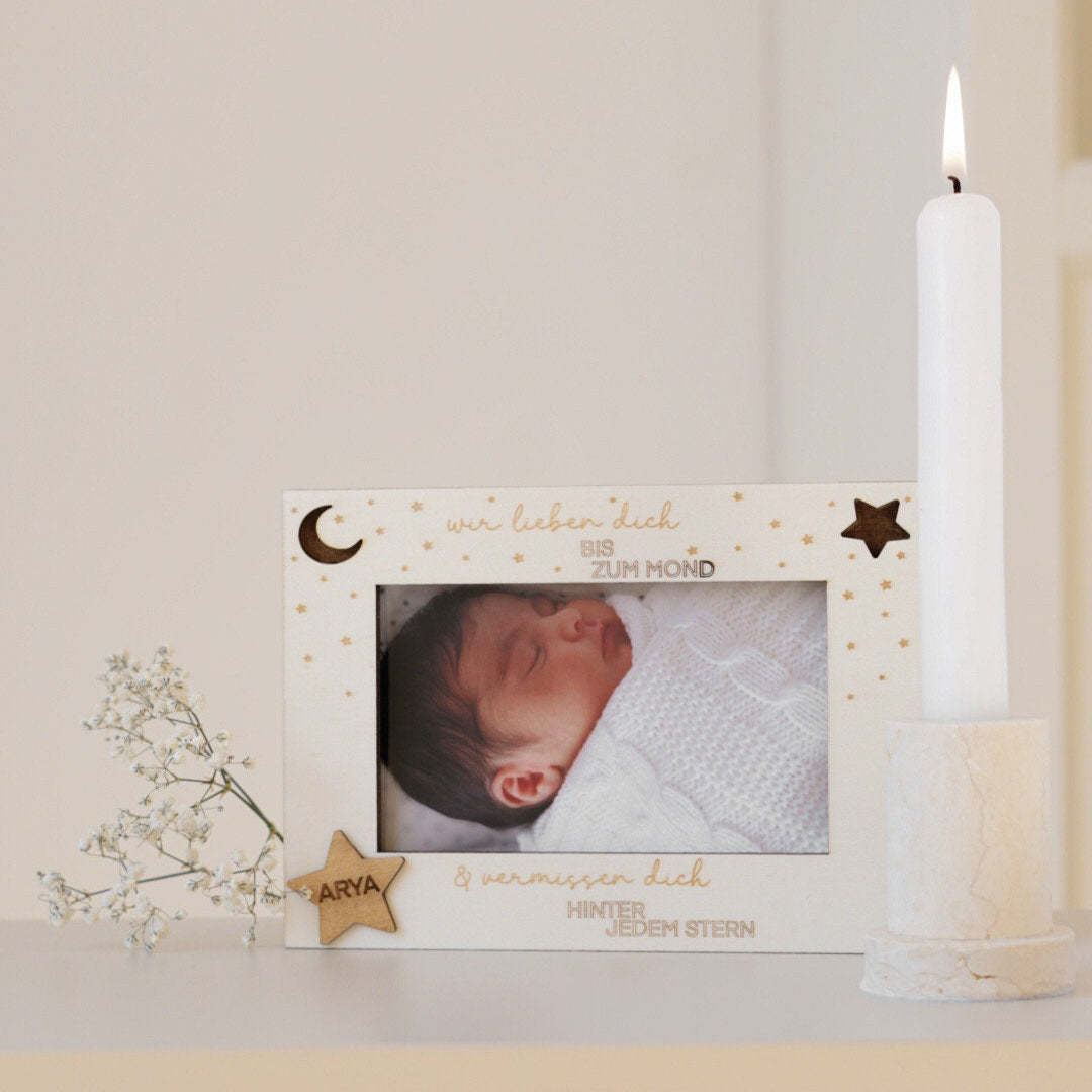 Bilderrahmen aus Holz mit dem Spruch „ Wir lieben dich bis zum Mond & vermissen dich hinter jedem Stern". Der Stern ist Personalisierbar mit dem gewünschten Namen. Bitte bei Bestellung, den gewünschten Namen eingeben.