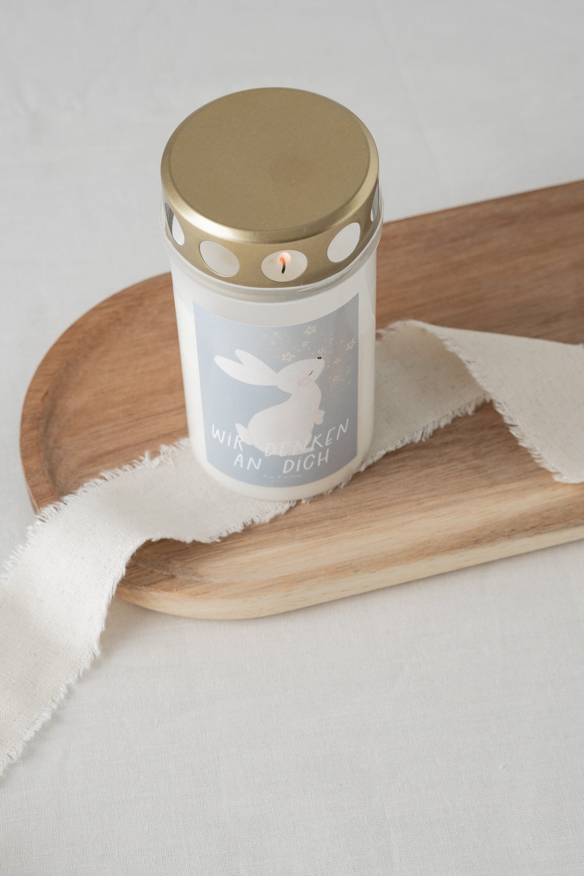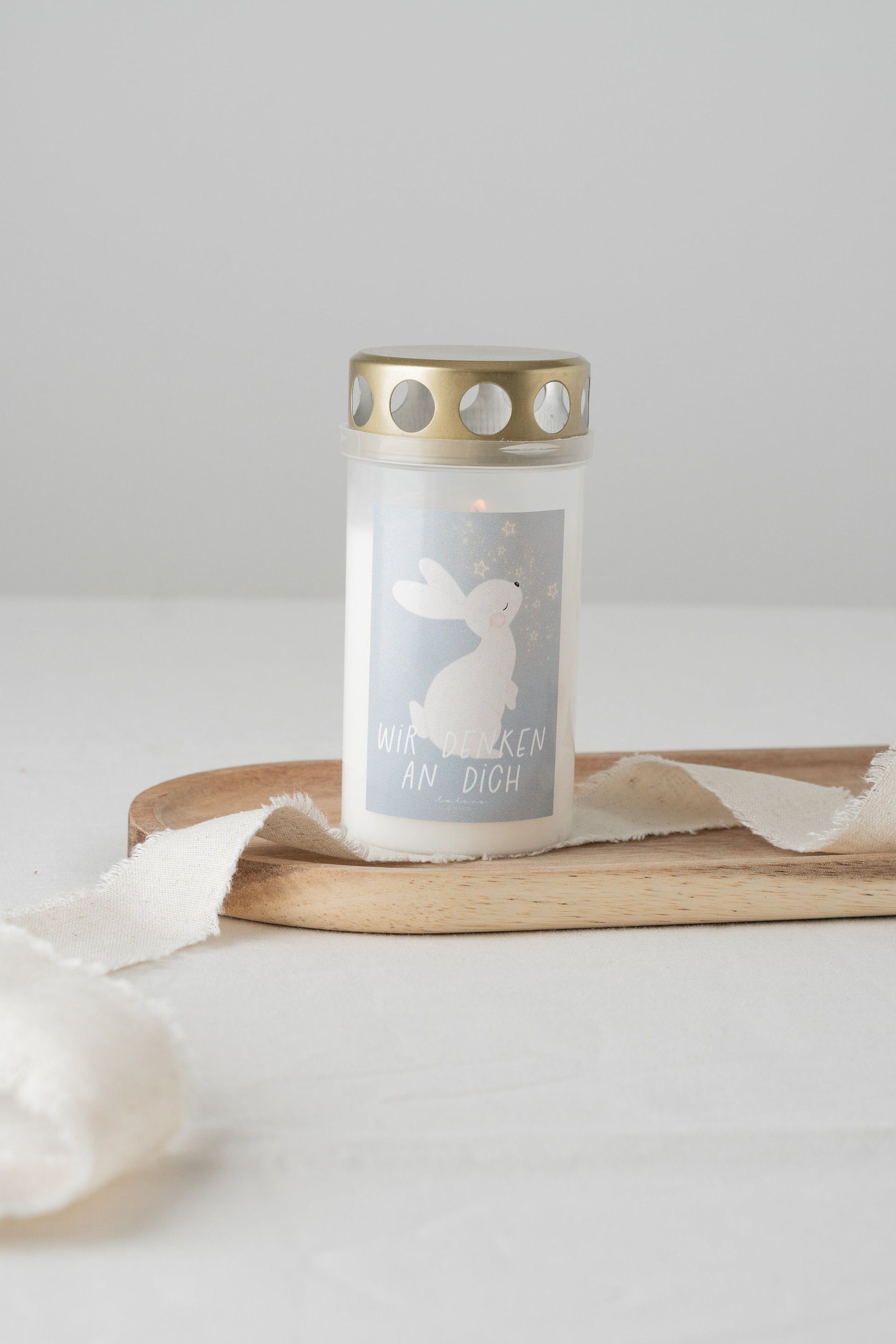 Grabkerze Hase mit Spruch "Wir denken an dich" Trauerkerze Trauergeschenk Himmelsgeburtstag Grabschmuck