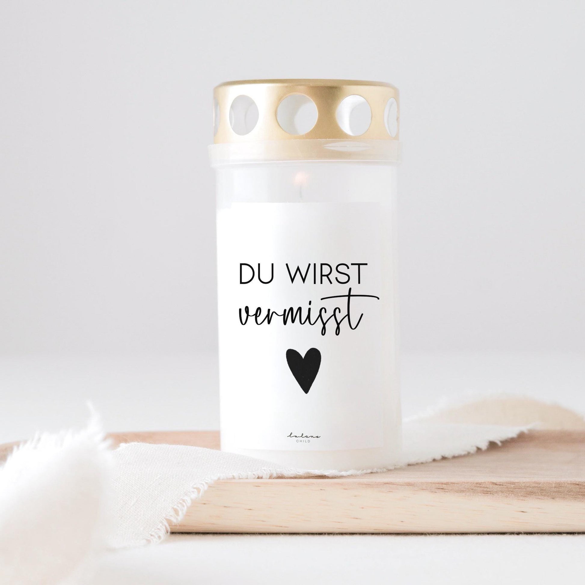 Ein stilles Licht der Erinnerung für einen geliebten Menschen. Diese besondere Grabkerze trägt die einfühlsamen Worte „Du wirst vermisst", begleitet von einem kleinen schwarzen Herz. Sie schenkt Trost, symbolisiert Liebe und Verbundenheit und lässt die Erinnerungen an einen wertvollen Menschen weiterleuchten.