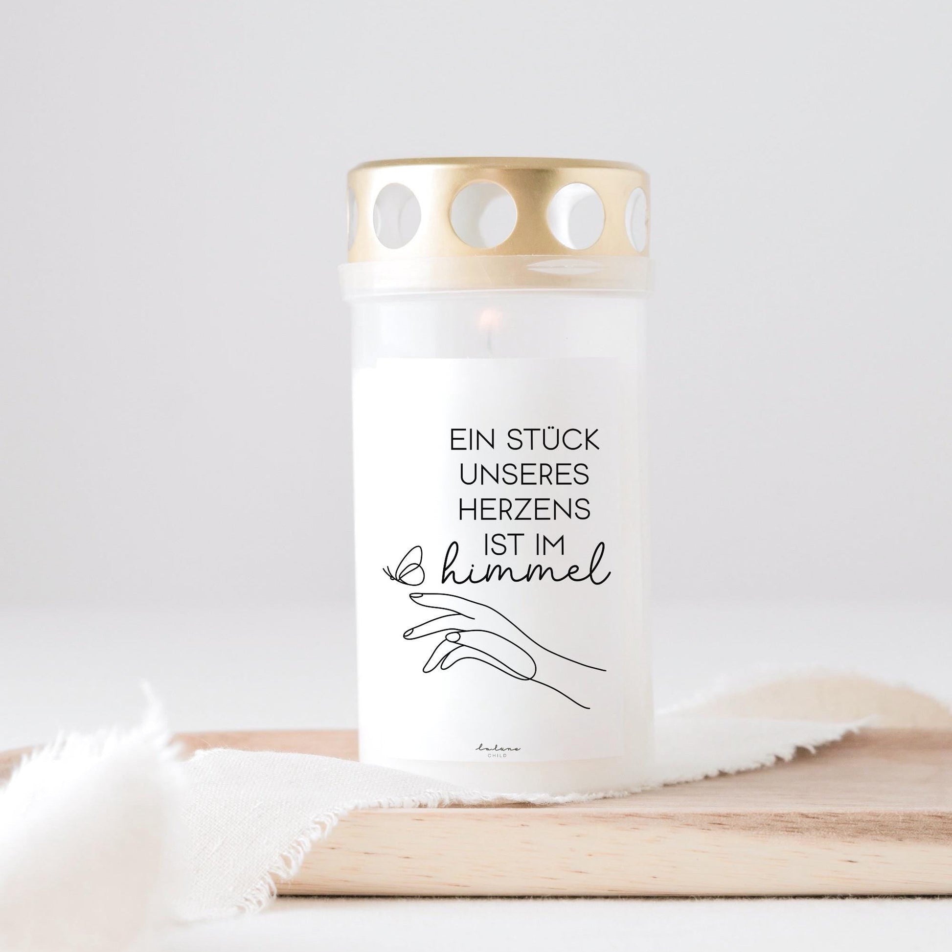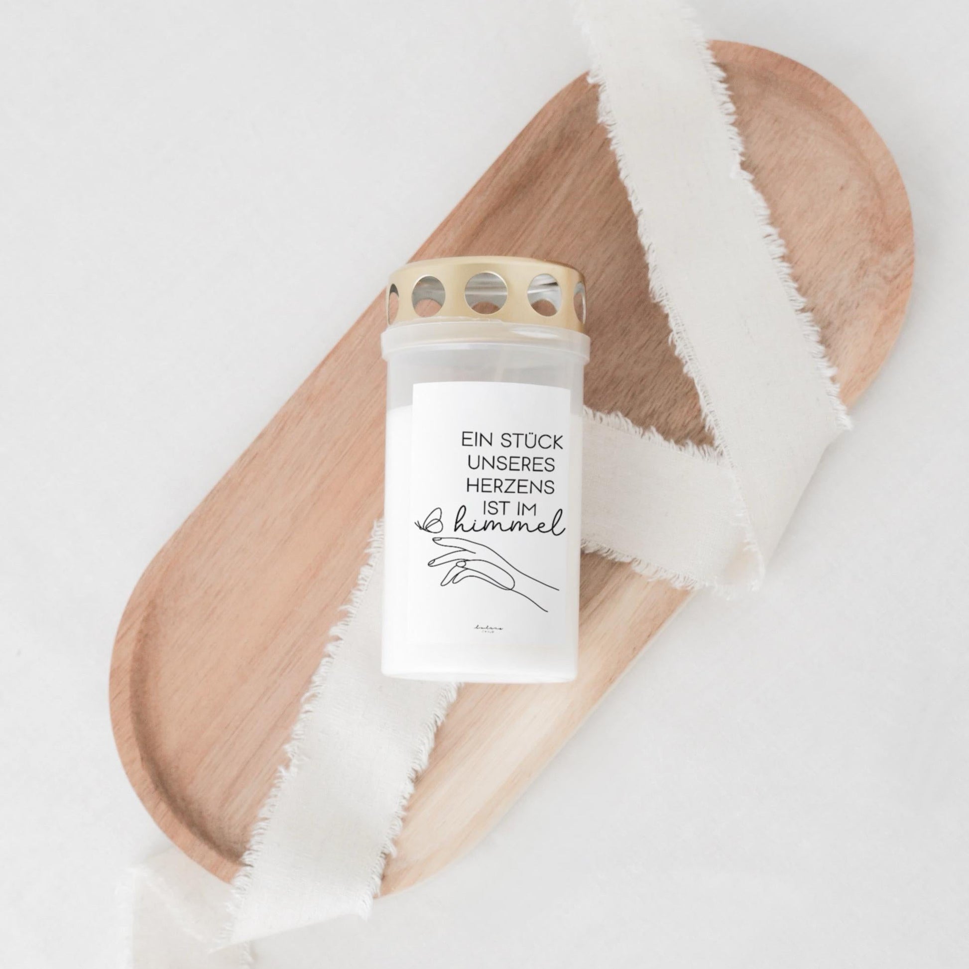 Ein Symbol der Liebe und des Abschieds. Diese einfühlsame Grabkerze zeigt eine Hand, aus der ein Schmetterling davonfliegt - ein berührendes Bild für das Loslassen und die Erinnerung an einen geliebten Menschen. Die Worte „Ein Stück unseres Herzens ist im Himmel" spenden Trost und erinnern daran, dass die Verbindung bleibt, auch wenn die Wege sich trennen.