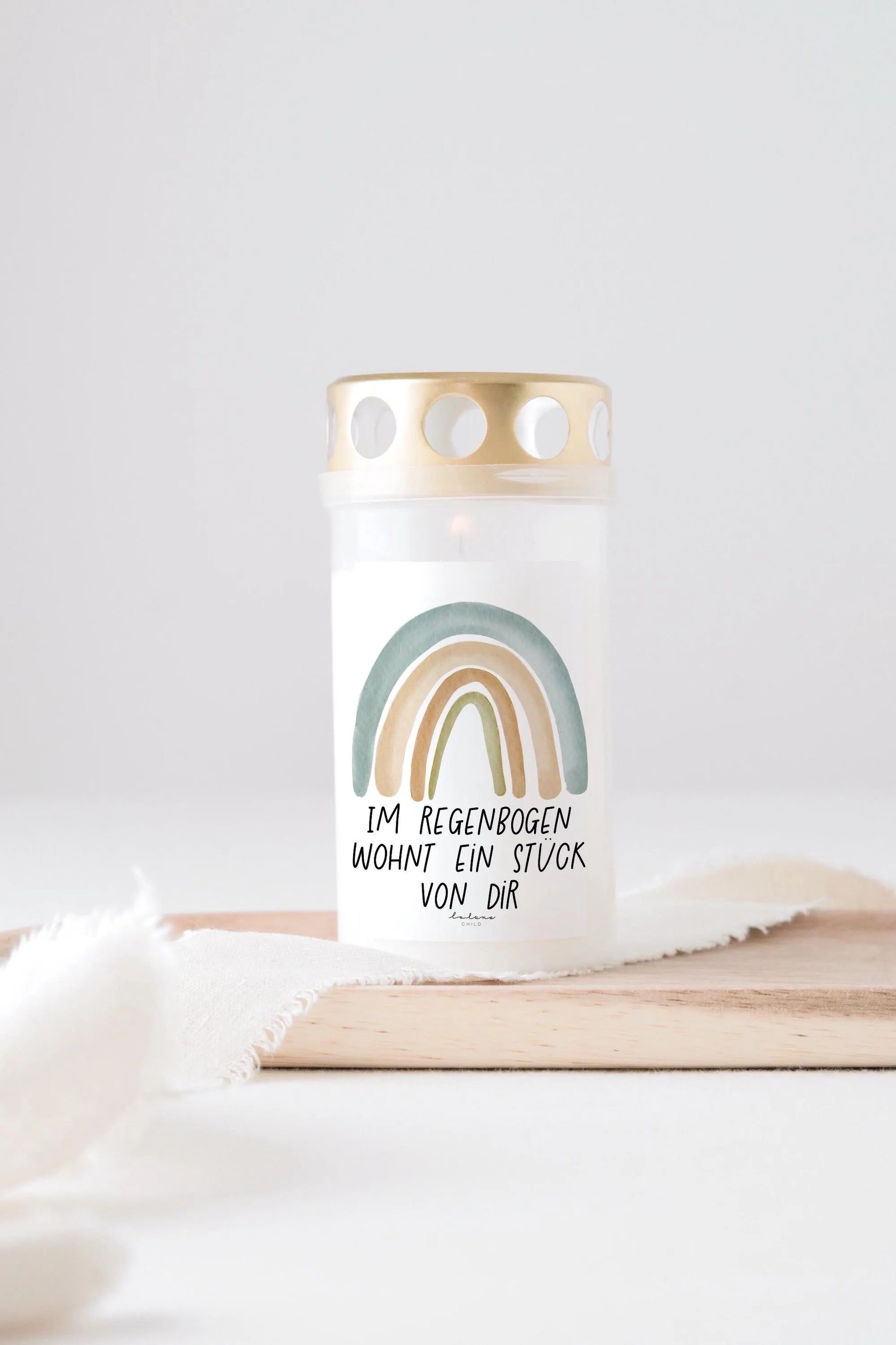Ein zartes Licht für ein unvergessenen Menschen. Diese einfühlsame Grabkerze zeigt einen zarten Regenbogen in Blautönen.