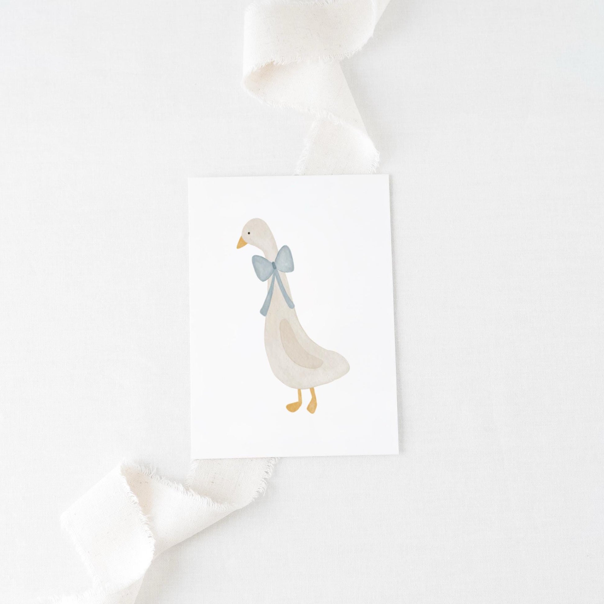 Liebevoll von mir gestaltete Postkarte in A6 mit einer Gans mit blauer Schleife.