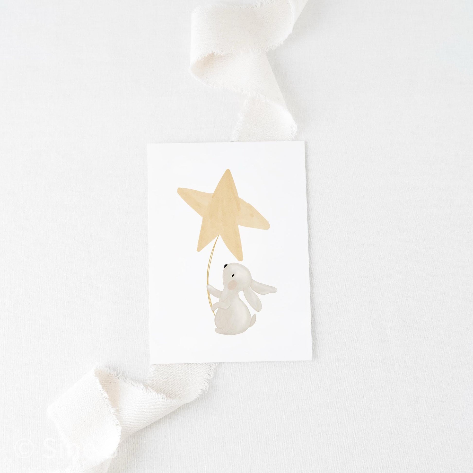 Liebevoll von mir gestaltete Postkarte in A6 mit einem Hasen und einem Stern. Gedruckt auf hochwertigem Naturpapier 300g/m2. Die Rückseite ist bis auf ein kleines Label unbedruckt, so dass du liebe Worte hinterlassen kannst.